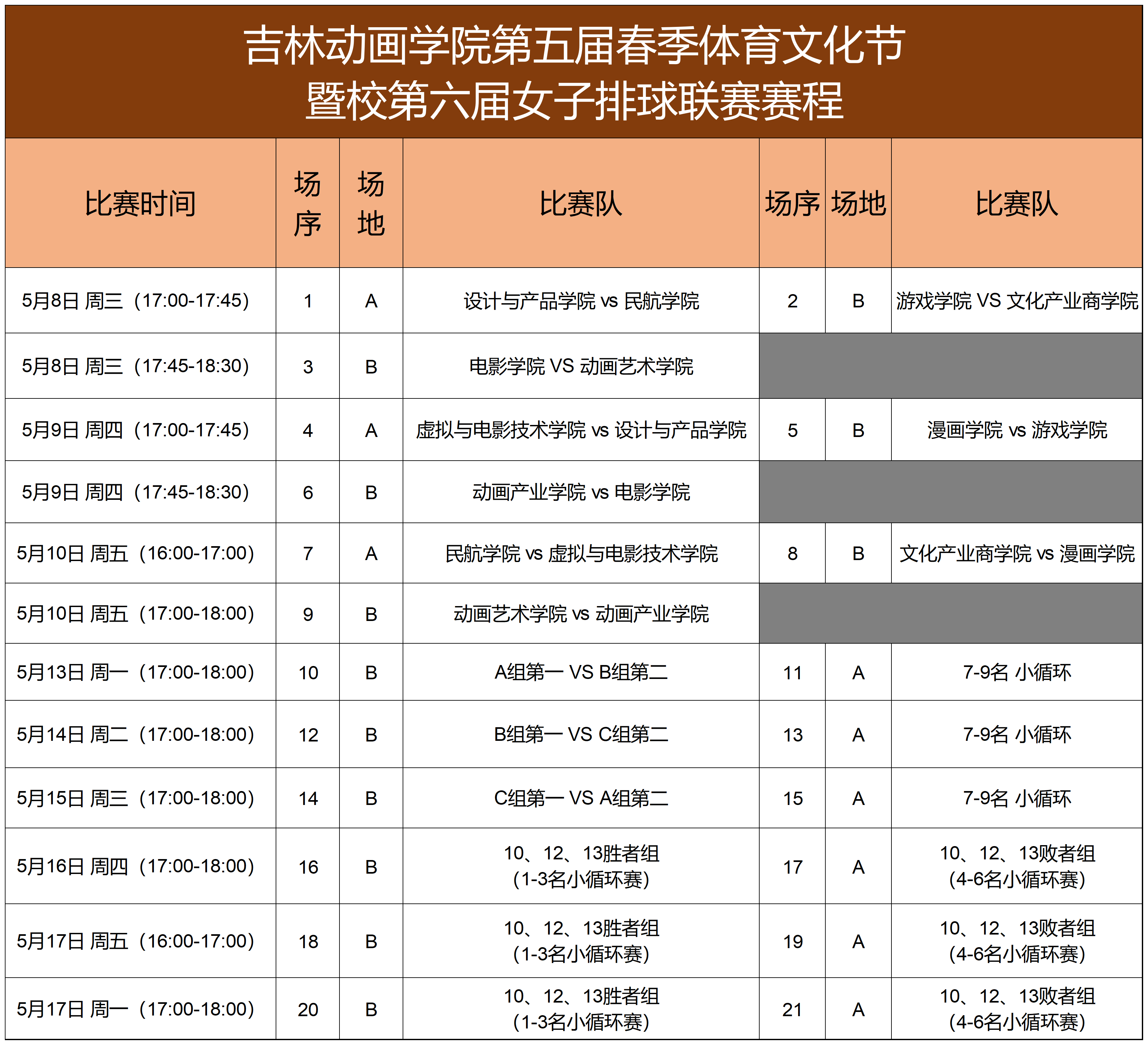 吉林动画学院第五届春季体育节女子排球比赛赛程公示