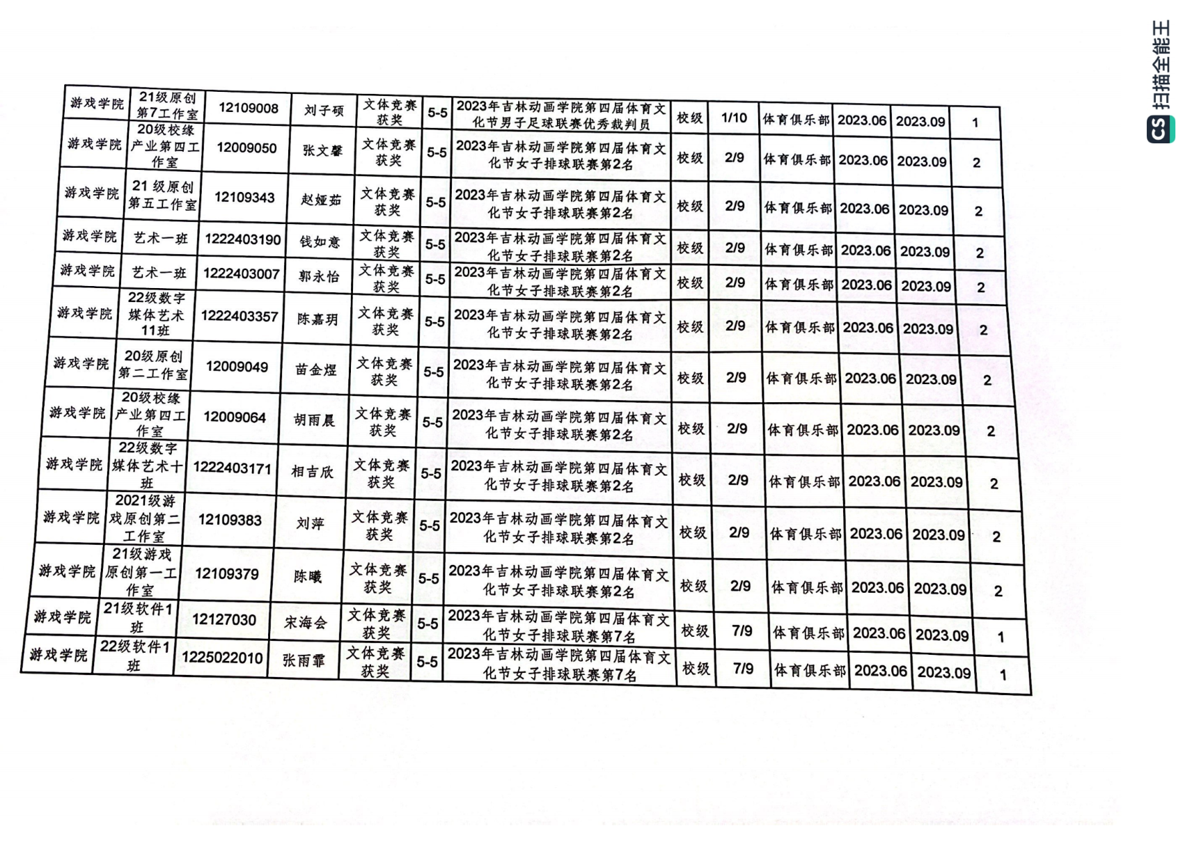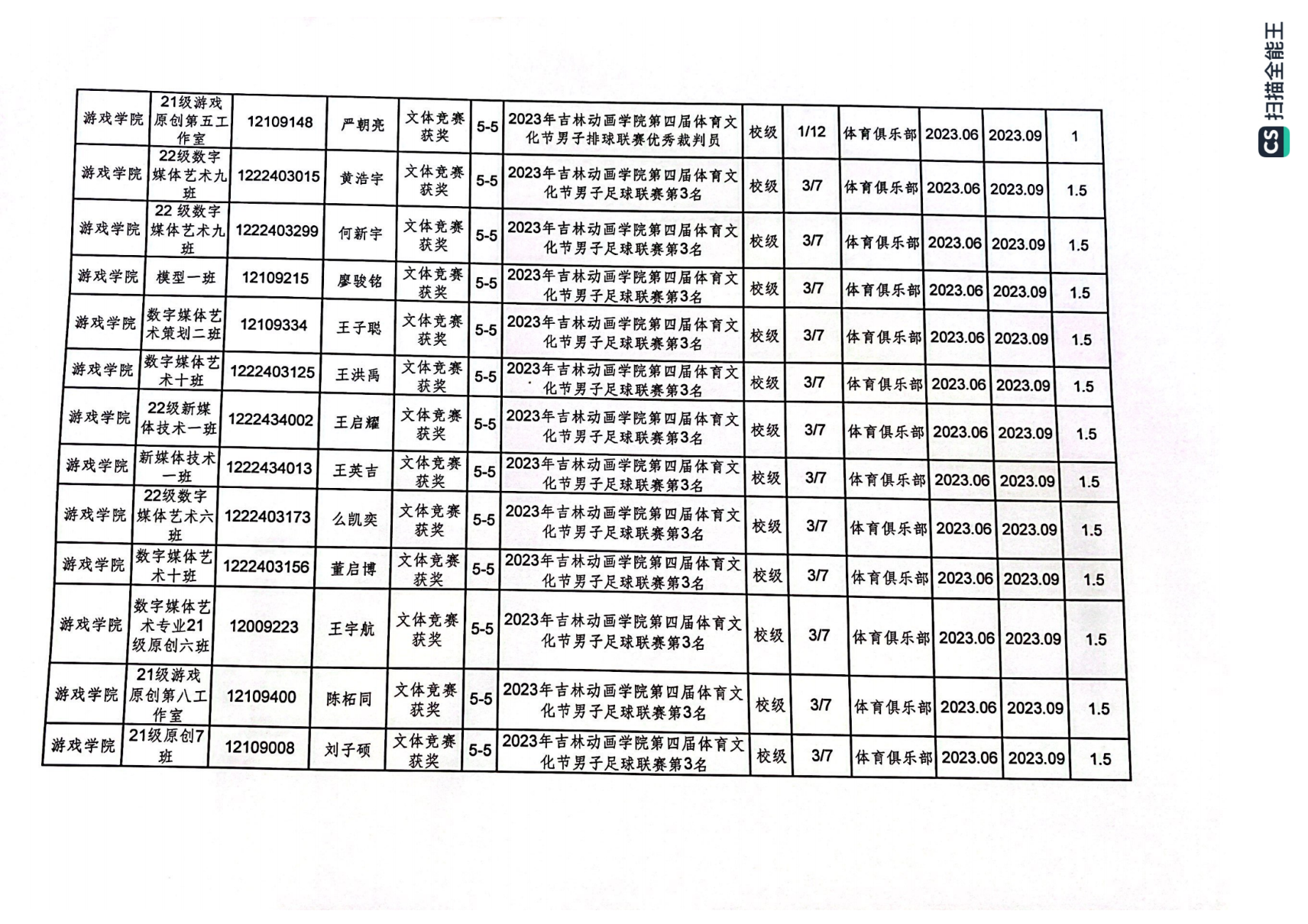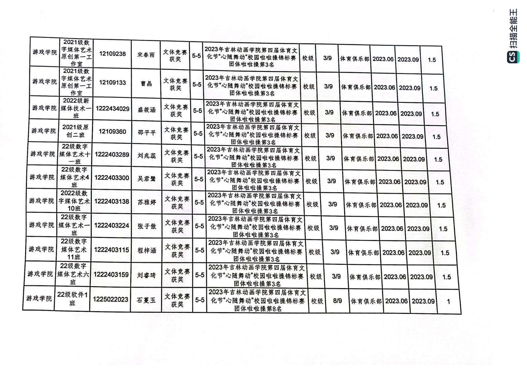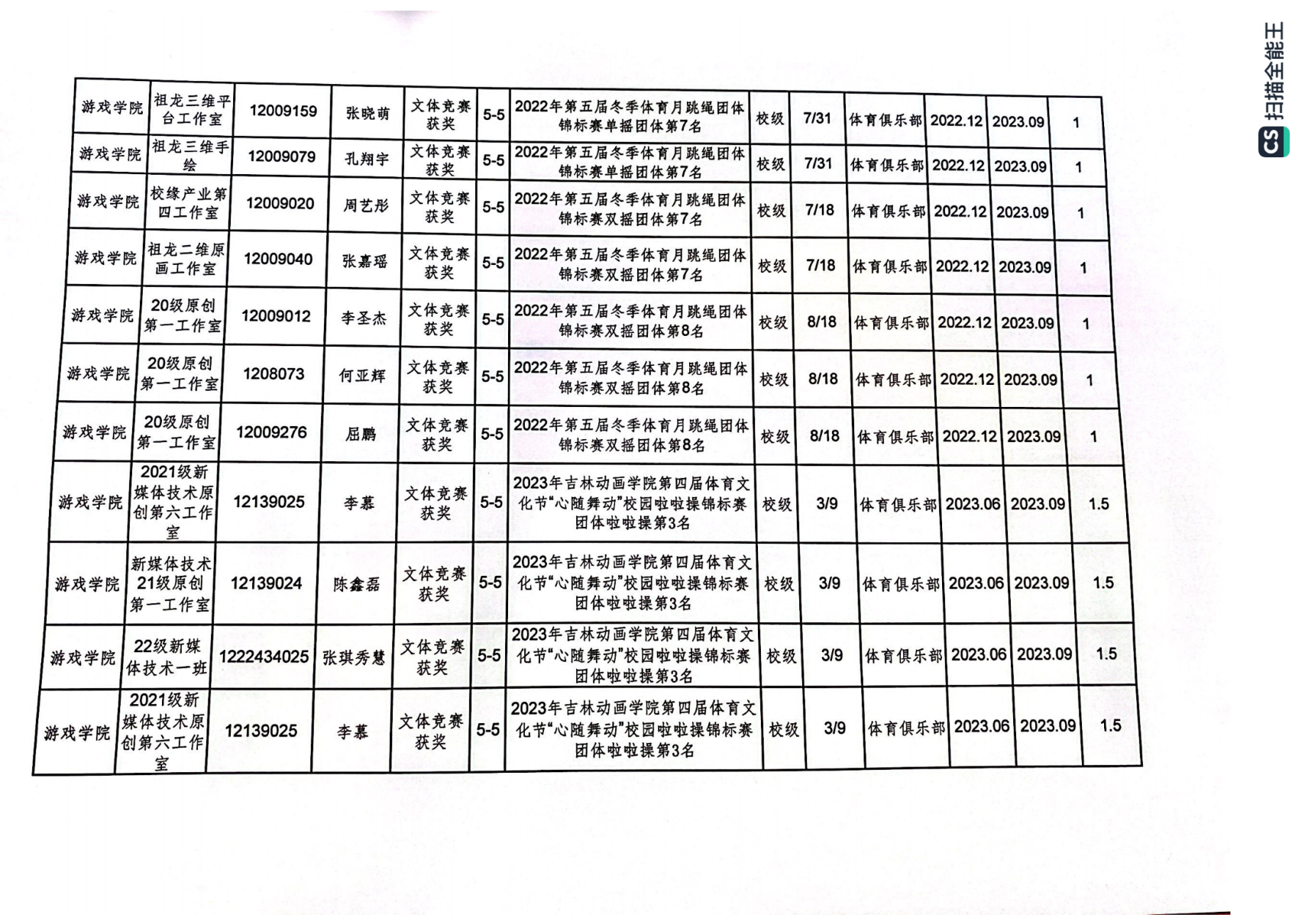 2023年游戏学院体育创新学分认定公示表