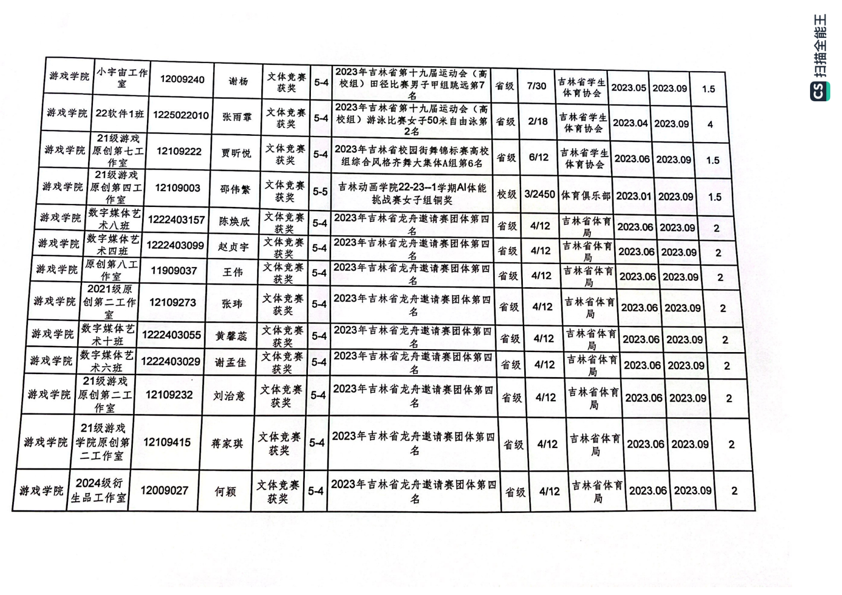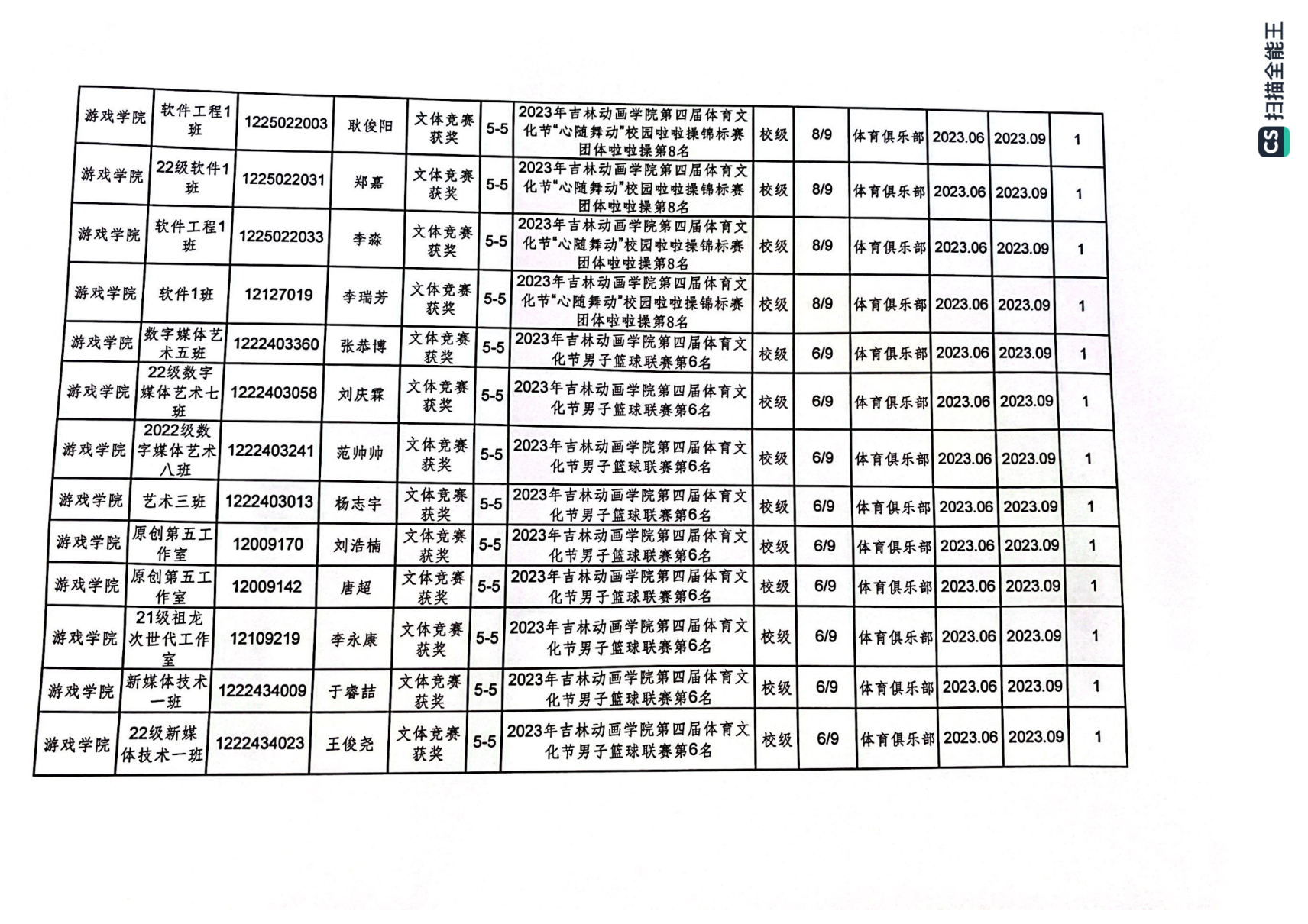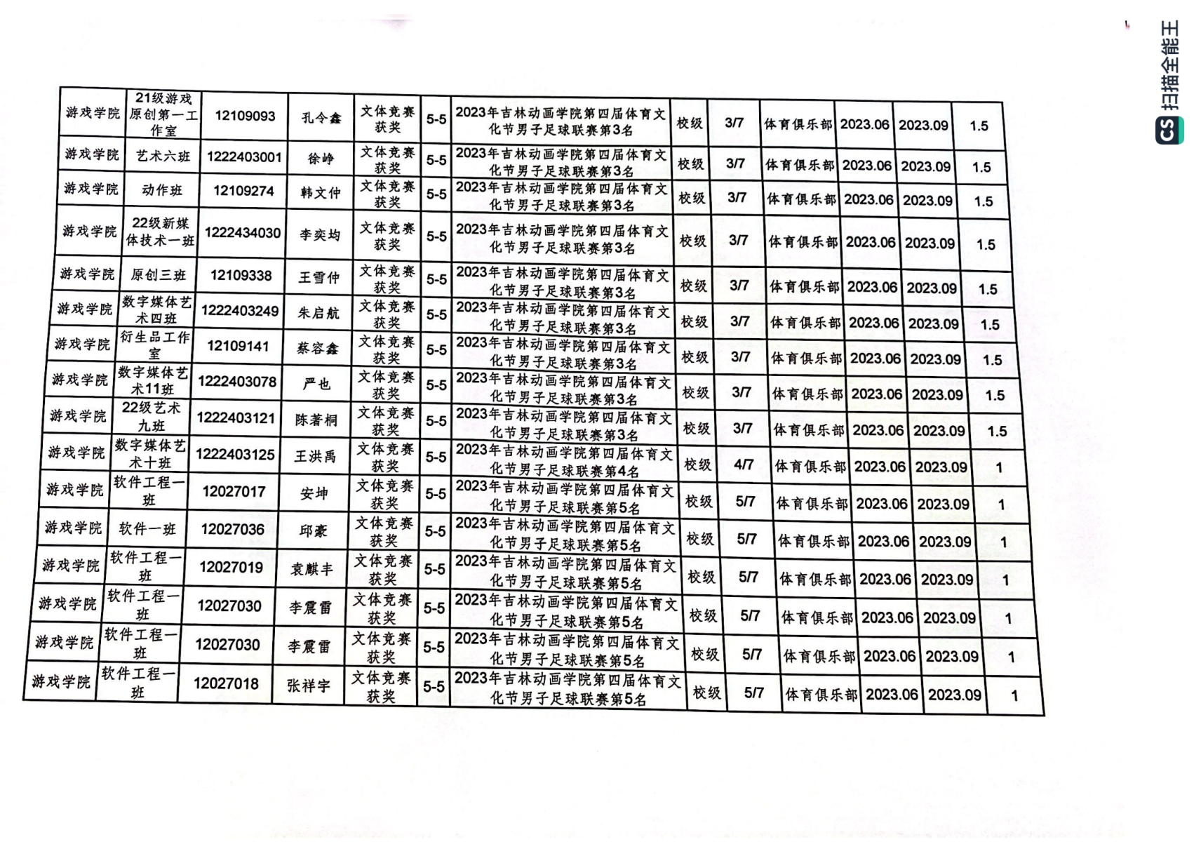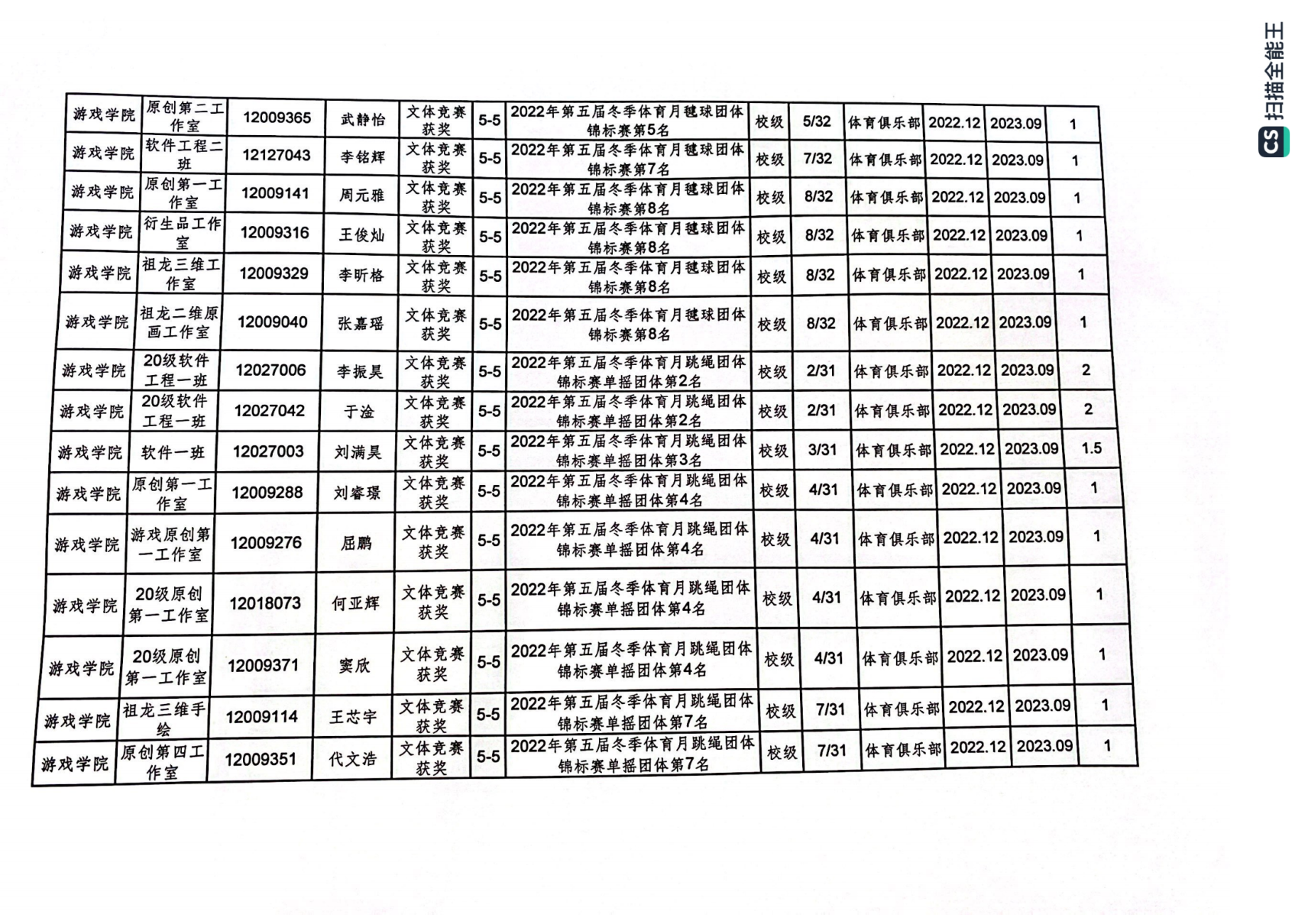 2023年游戏学院体育创新学分认定公示表