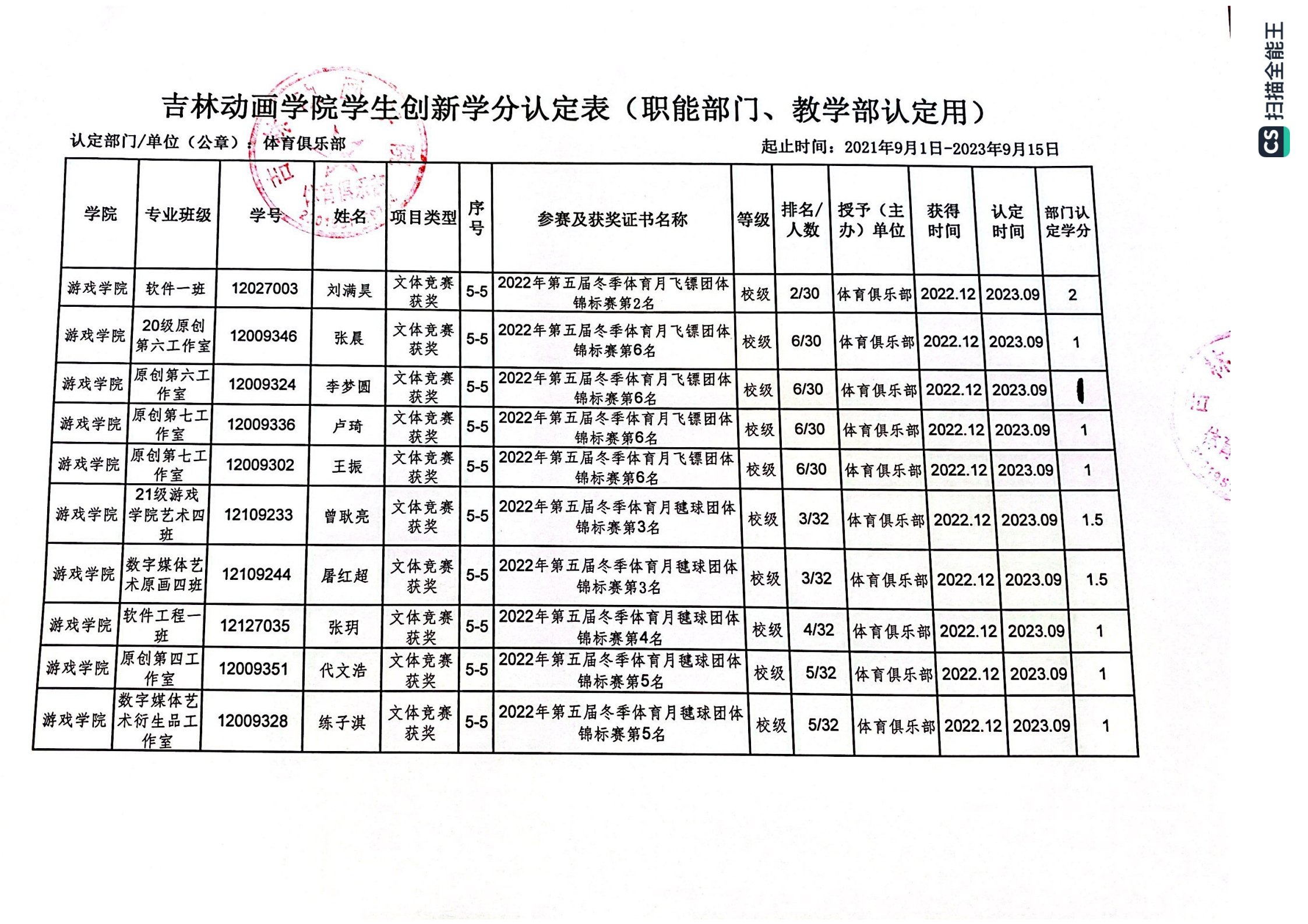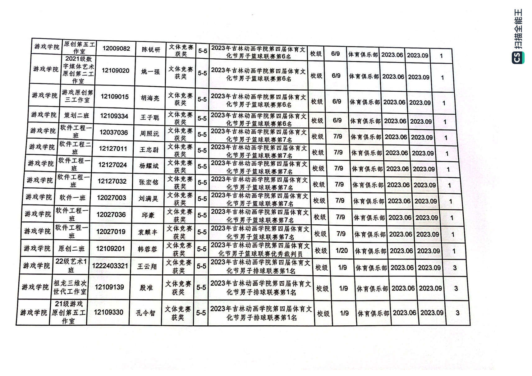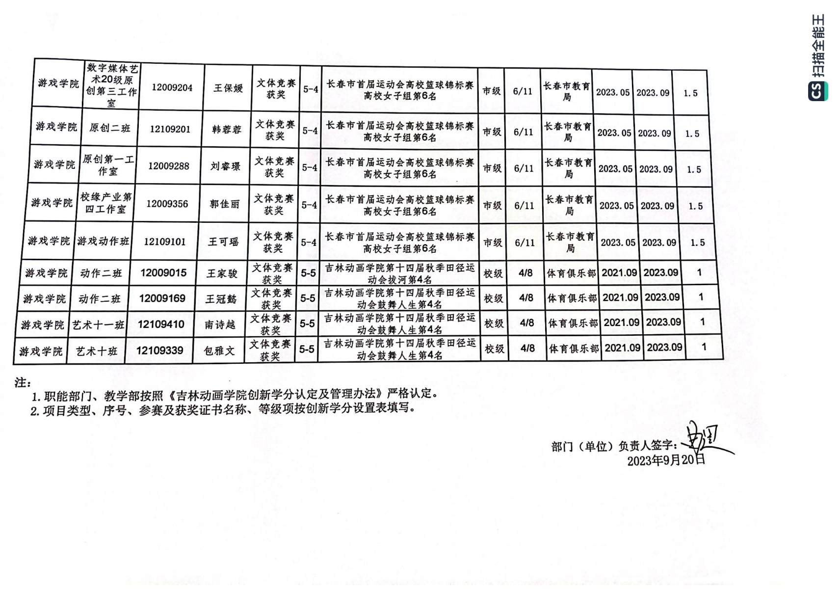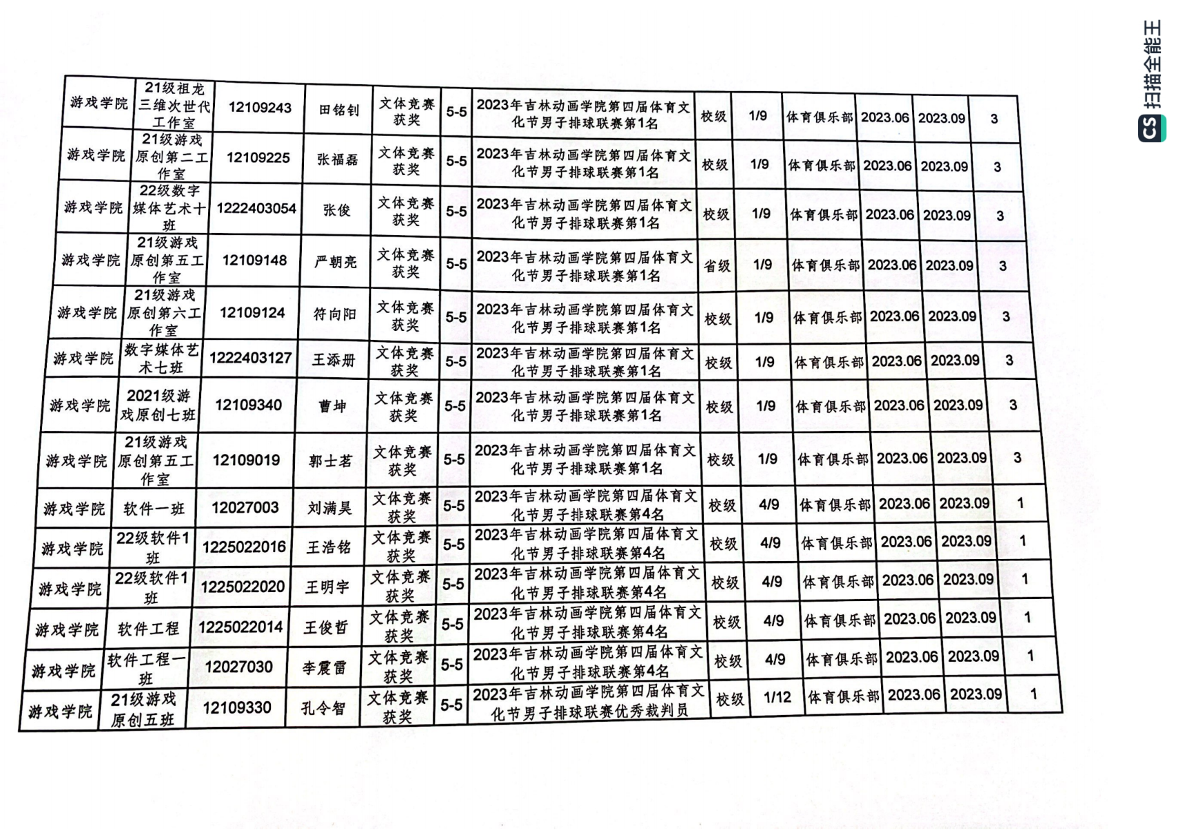 2023年游戏学院体育创新学分认定公示表