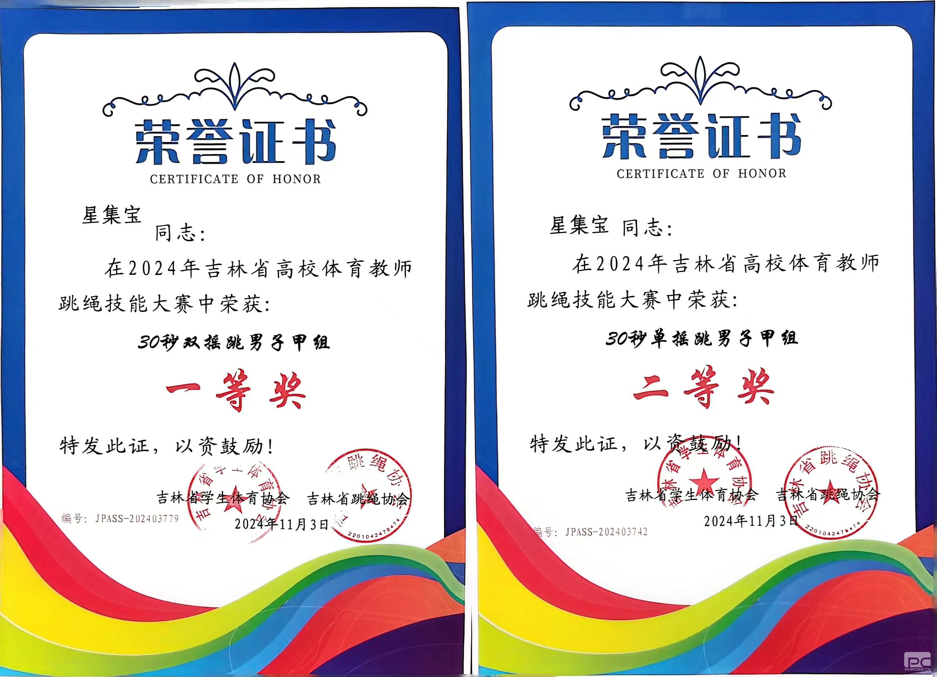 本次比赛的个人项目中设置了男、女子30秒单摇跳、30秒双摇跳、30秒间隔交叉单摇跳6个项目,我校体育俱乐部教师星集宝在比赛中脱颖而出,斩获男子30秒双摇跳一等奖、30秒单摇跳二等奖。